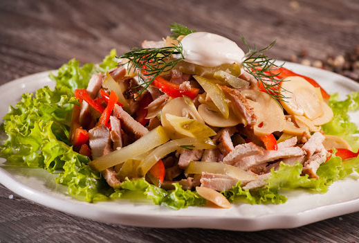 Свинина, курица, язык говяжий, помидоры черри, яйцо перепелки, соус, сыр, зелень