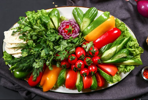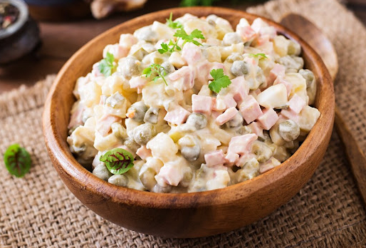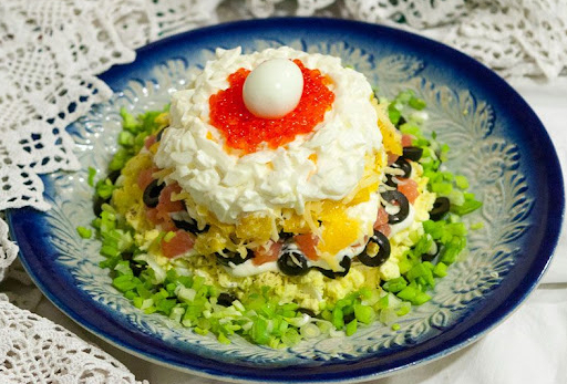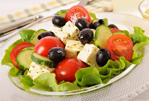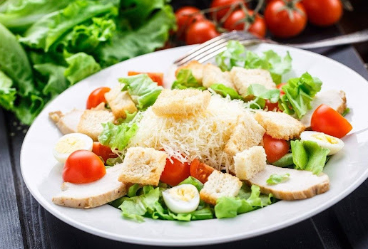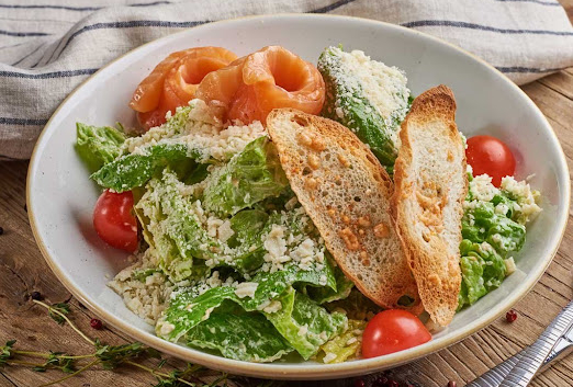 Салат микс, креветки, кальмар, чеснок, сливки, лиимон , помидор черри, масло оливковое.