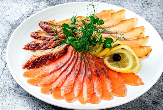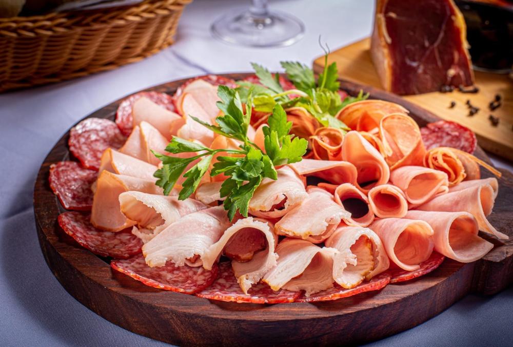 Сырокопчёная колбаса, маринованная телятина, рулет куриный, горчица, зелень